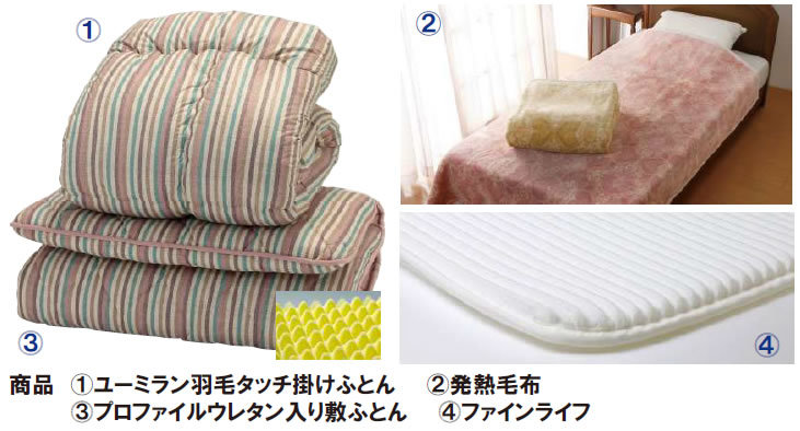 ①の中身は羽毛ではなく特殊中綿で、羽毛と変わらず、総重量、保温効果も抜群。そのうえ、ハウスダストの軽減!アレルギーの原因とされるホコリも大幅に減らした優れもの。②は「発熱毛布」。簡単に言えば、近年人気インナーとなったヒートテックの毛布版。人間の体から自然と出てくる寝床内の湿気を吸収しながら発熱するからあたたかい。さらに保温効果もあります!